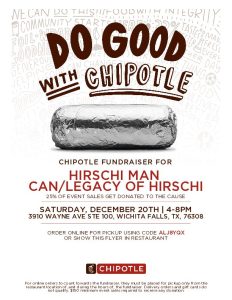 Join us for dinner with purpose! Chipotle Mexican Grill is partnering with the Legacy of Hirschi Scholarship Fund to help raise money for scholarships supporting Wichita Falls students.